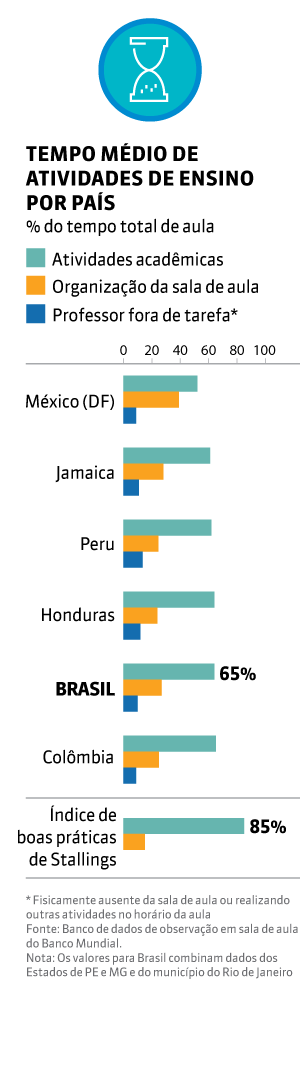 Após observação de mais de 15 mil salas de aula em sete países da América Latina e Caribe, pesquisadores do Banco Mundial identificaram que boa parte do tempo de aula era desperdiçado com tarefas não relacionadas à aprendizagem do estudante. Pelo método utilizado, conhecido como Stallings, espera-se que um bom professor dedique 85% do tempo de uma aula para ensinar, perdendo apenas 15% com tarefas burocráticas como fazer chamada ou manter a disciplina. No Brasil, apenas 65% do tempo de aula era dedicado a atividades de ensino. Os pesquisadores do Banco Mundial, porém, identificaram em várias escolas uma grande variação da qualidade da aula. Numa escola de Minas Gerais com bons resultados, havia docentes que conseguiam dedicar 100% do tempo de aula ao aprendizado, enquanto colegas do mesmo estabelecimento não passavam de 40%. Em outra, a variação era de 20% a 80%. O mesmo fenômeno já havia sido captado numa pesquisa de 2010 do Instituto Unibanco e do Ibope Inteligência, que analisou a audiência do Ensino Médio observando em profundidade o cotidiano de 18 escolas de três grandes regiões metropolitanas. Em algumas escolas, 89% do tempo de aula previsto foi de fato realizado. Em outras, o percentual foi de apenas 52%. Na média do grupo analisado, foram 71%.
