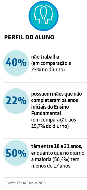 Além disso, são alunos mais velhos: metade dos matriculados nesse período tem entre 18 e 21 anos, enquanto que no diurno a maioria (56,4%) tem menos de 17 anos. O alto índice de defasagem idade-série (53%) também explica em parte a elevada média de idade desses estudantes.