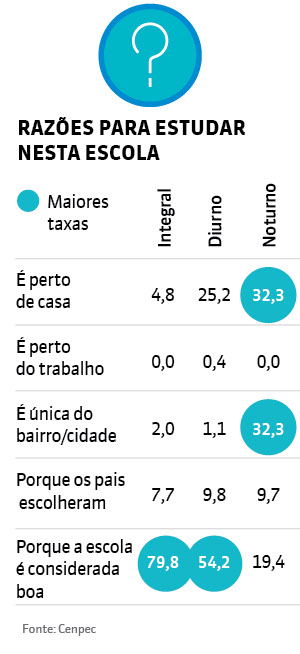 A pesquisa revela, por exemplo, que no caso dos alunos do noturno a escolha da escola é motivada principalmente pela sua proximidade com o local de residência ou por ser a única do bairro enquanto que para os estudantes do diurno ou em período integral, a reputação da escola é a principal razão.