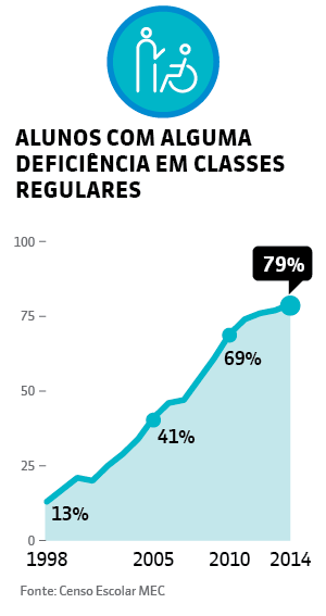 Ainda que os desafios de acesso e progressão continuem significativos, a análise dos dados de todos os cerca de 900 mil alunos com alguma deficiência matriculados em todos os níveis da educação básica revela que houve avanço expressivo na proporção desses estudantes matriculados em classes comuns. Em 1998, apenas 13% conviviam com as demais crianças nas mesmas salas de aula. Em 2014, este percentual já era de 79%, sendo 98% no ensino médio, em que pese ainda serem poucos os jovens com deficiência que chegam até este nível de ensino.
