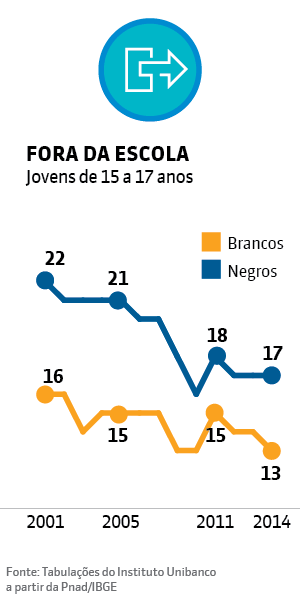 Se o país foi eficiente em aumentar significativamente a presença de seus jovens, especialmente dos negros, no Ensino Médio, o mesmo não pode ser dito da evasão escolar. Neste indicador, os avanços foram bem mais lentos, o que sinaliza a dificuldade de evitar que uma parcela nada desprezível de sua população abandone os estudos sem completar o Ensino Médio ou, o que é ainda mais comum, até mesmo antes de chegar a esta etapa. Considerando o ritmo de melhoria dos últimos anos, nada indica que o país conseguirá cumprir até 2016 o que está previsto na Emenda Constitucional nº 59 e no Plano Nacional de Educação: a matrícula de todas as crianças de 4 a 17 na escola. E, para esta meta, o principal desafio é justamente a faixa etária de 15 a 17 anos, em que o percentual de jovens fora da escola chega a 17% entre negros e a 13% entre os brancos.