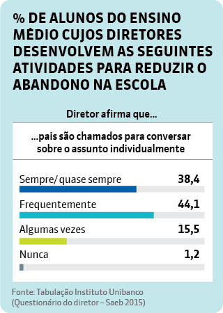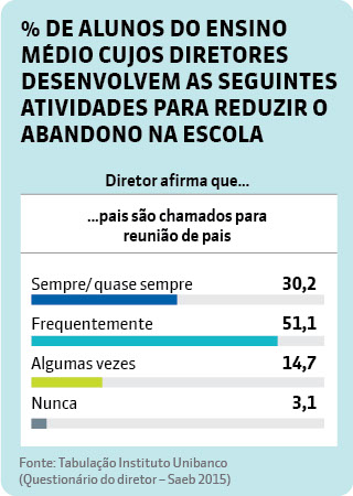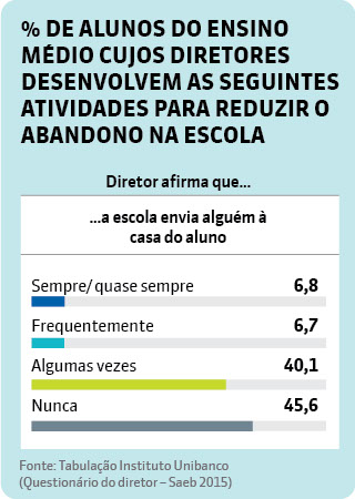 Dados tabulados pelo Instituto Unibanco das respostas dos diretores ao questionário do Saeb indicam que grande parte dos gestores tem encontrado dificuldades para lidar com o problema: 41% dos estudantes estudam em escolas onde os diretores dizem que as soluções adotadas para reduzir o abandono ainda são insatisfatórias. Outros 5% estão em escolas onde os gestores reconhecem que, apesar de haver esse problema, nada ainda foi feito para combatê-lo. Apenas 24% consideram os resultados de ações contra o abandono satisfatórios.