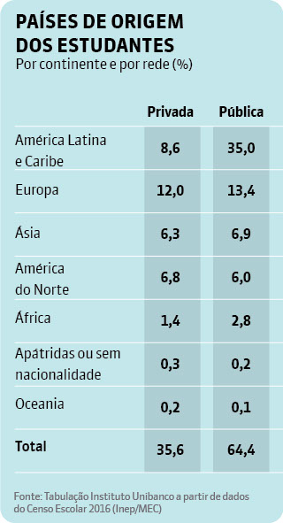 Os dados do Censo mostram que os latinos representam mais de 40% dos alunos estrangeiros e concentram-se principalmente na rede pública. São seguidos pelos estudantes de origem europeia, asiáticos e norteamericanos.