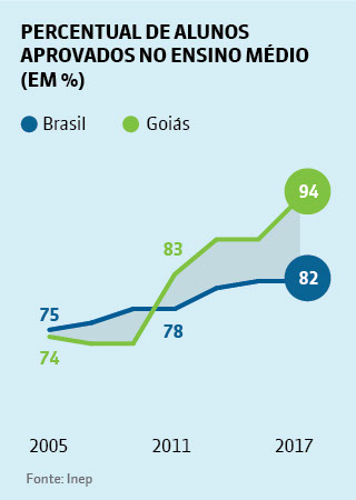 O primeiro caso a ser retratado é o de Goiás, única rede estadual no país que conseguiu superar a meta traçada pelo MEC para esta etapa. De 2007 a 2017, enquanto o Ideb nacional variou apenas 0,3 ponto (de 3,2 para 3,5), Goiás deu um salto de 1,5 ponto (de 2,8 para 4,3), superando em 0,1 ponto a meta de 4,2 estimada para 2017. Foi a maior média do Brasil entre redes públicas estaduais no índice, que congrega taxas de aprovação com o desempenho dos alunos em testes de português e matemática.