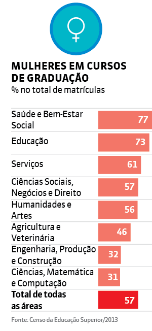 Essa realidade é verificada também no Brasil, pelos dados do Censo da Educação Superior. Nos cursos de áreas de Saúde, Bem-Estar Social e Educação, a proporção de mulheres é superior a 70%. Já nas carreiras de Engenharias, Ciências, Matemática ou Computação, o percentual fica ao redor de 30%.