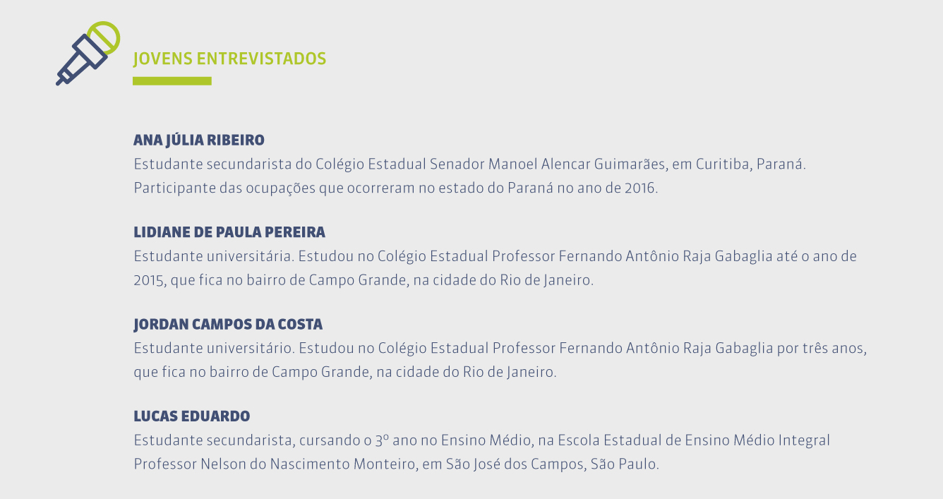 Neste artigo optamos por entrar no debate sobre participação juvenil e educação apresentando algumas perspectivas de quatro jovens oriundos de escolas públicas de Ensino Médio de três estados brasileiros – Rio de Janeiro, São Paulo e Paraná –, que foram entrevistados durante o Seminário Internacional “Desafios Curriculares do Ensino Médio”, realizado entre os dias 09 e 10 de novembro de 2016 na cidade de São Paulo. Sendo assim, nosso principal objetivo é dar visibilidade às vozes dos estudantes que, certamente, têm muito a contribuir para o debate sobre a educação em nosso país.